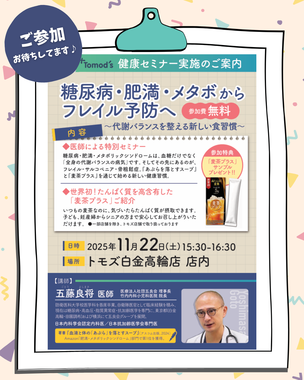 五良会クリニック白金高輪 理事長 五藤良将による特別セミナーを、クリニックと同じ建物内にある【トモズ白金高輪店】にて開催いたします!